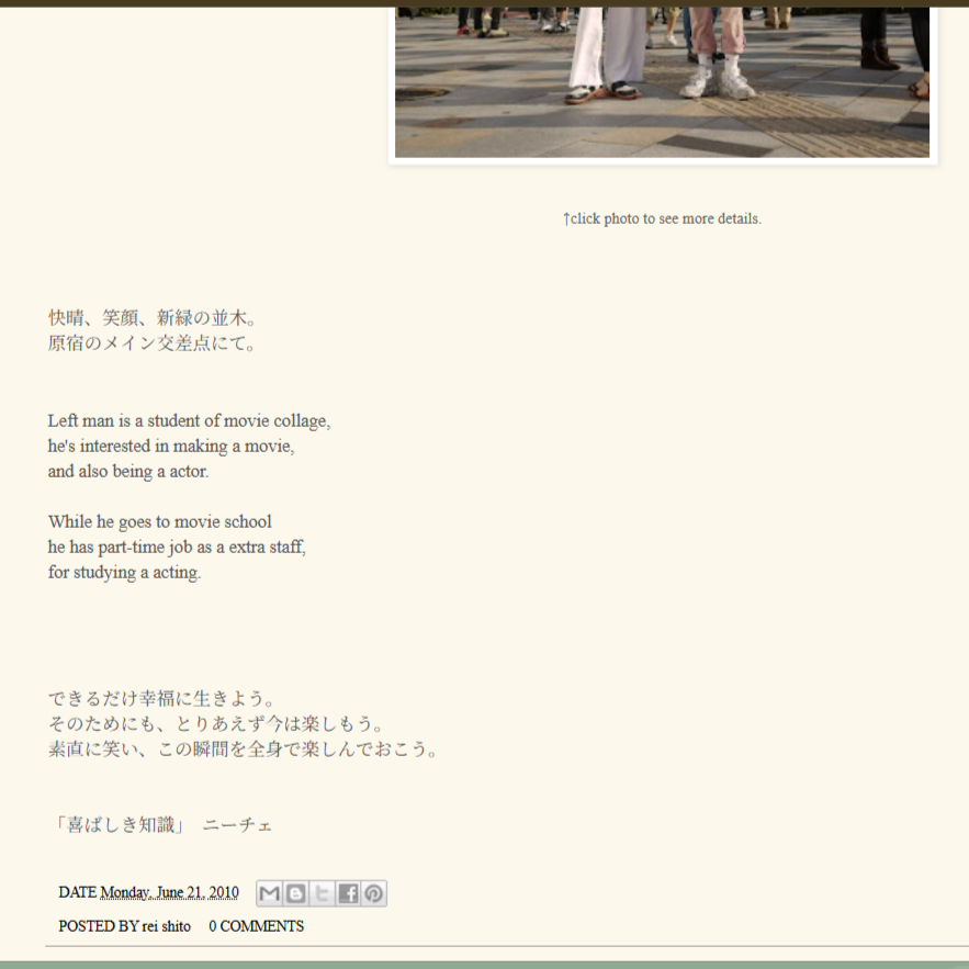 7: 2010年6月、人気ストリート・ファッションウィーク・フォトグラファー シトウレイ さん撮影・テキスト「左の彼は、映画を作ること・演じる(俳優になる)ことに興味がある映画カレッジの学生。学校に通いながら、演技の研究のため、エキストラスタッフとして働く」